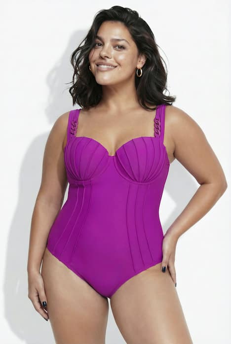 Badeanzug mit Biesen und dekorativen Doppelträgern, innerer Träger verstellbar. Vorgeformte Bügel-Cups, Rückenverschluss, weiches Vorderfutter.