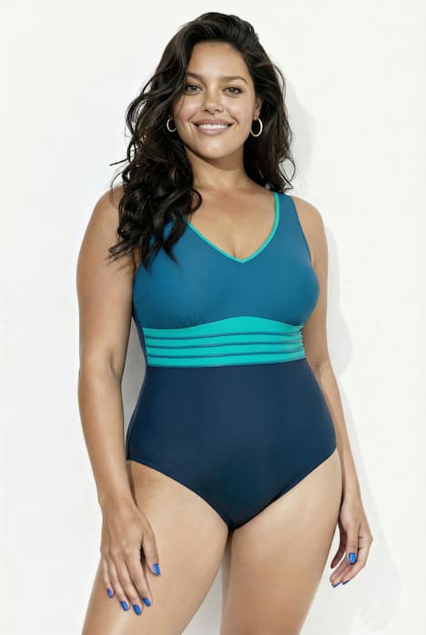 Badeanzug, Gold-Piping, Softcups, V-Ausschnitt, recycelt