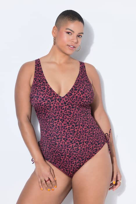 Badeanzug mit seitlichen Raffungen und Leo. Herausnehmbare Softcups, Unterbrustband. V-Ausschnitt, tiefer Rückenausschnitt, hoher Beinausschnitt. Shaping-Effekt durch Mesheinsatz . Verstellbare Träger.