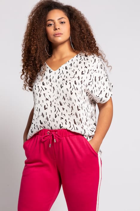Blusenshirt mit Black/White Print. Oversized mit V-Ausschnitt und Halbarm. Saum hinten gerundet und länger.