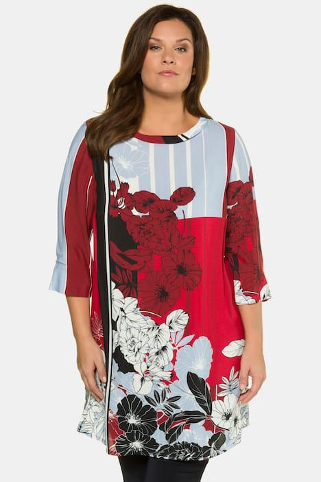 Longtunika mit gepatchtem Design aus Blüten und Streifen. Kleiner Rollkragen. Saum und 3/4-Ärmel mit Schlitz.