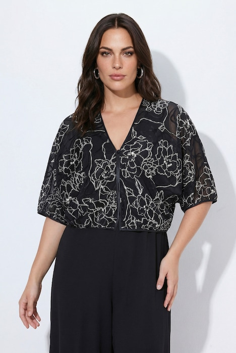 Bolero, kurzer Oversize Fit, aus elegantem Seidenmix-Ausbrenner mit floralem Design. Knopfverschluss, weiter Fledermausarm. Kanten mit fein schimmernden Satin-Einfassungen.
