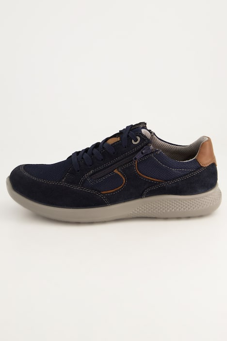 Herrenschuh, extra weit, von Jomos - made in Germany. Zipper neben der Schnürung. Obermaterial aus Leder und Mesh. AirCom - Das zu 100% atmungsaktive Alltags-Fußbett mit Softschaum-Polsterung und Oberfläche in Wildlederoptik für ein stets angenehmes Tragegefühl und ausgewogenes Schuhklima. Flexible Laufsohle. JP1880 - for real men only!