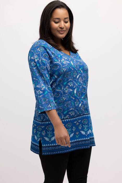 Longshirt im Bordüren Druck am Saum. V-Ausschnitt, 3/4-Ärmel. Seitenschlitze für noch mehr Tragekomfort.