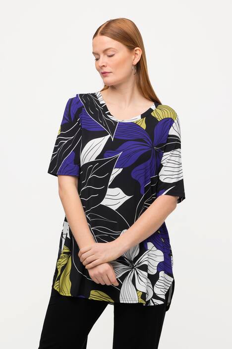Slinkyshirt, lange A-Line, mit Blüten-Design. Rundhalsausschnitt, gerundeter Saum mit Seitenschlitzen. Langer Halbarm. Die hochwertige, sehr glatte und etwas schwerere Slinkyqualität fühlt sich besonders weich und angenehm an und hat einen fließenden Fall. Die Elastizität des Stoffes sorgt für einen hohen Tragekomfort.